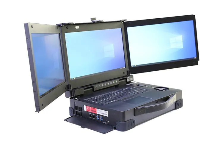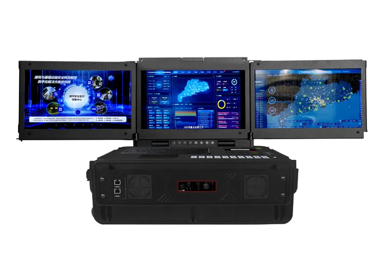 A triple-screen computer with one machine used in emergency command systems, integrating third-party software and hardware. It is primarily used in mobile servers, mobile workstations, mobile monitoring stations, or emergency command centers. The three screens are integrated into a single unit, featuring three outstanding 17.3-inch high-brightness LCD screens. These displays support 1920×1080 resolution and offer brightness ranging from 700 to 1000 nits, ensuring visibility in sunlight. This design facilitates graphic processing, data analysis, and interactive multi-screen applications. Equipped with a high-capacity battery and a spare battery, it allows customers to rapidly set up various application scenarios.